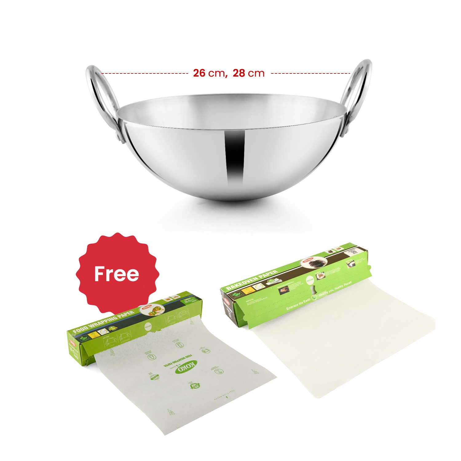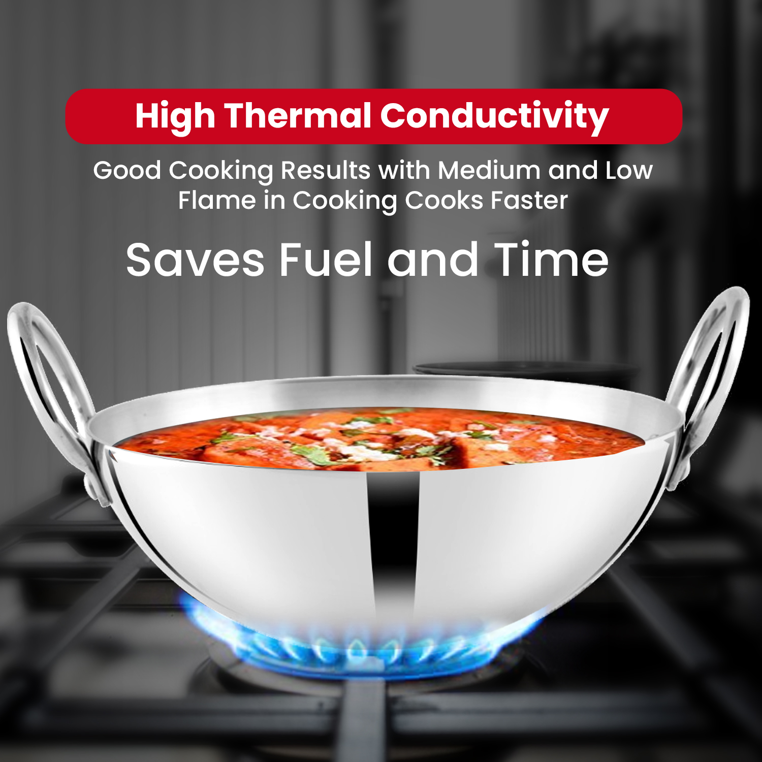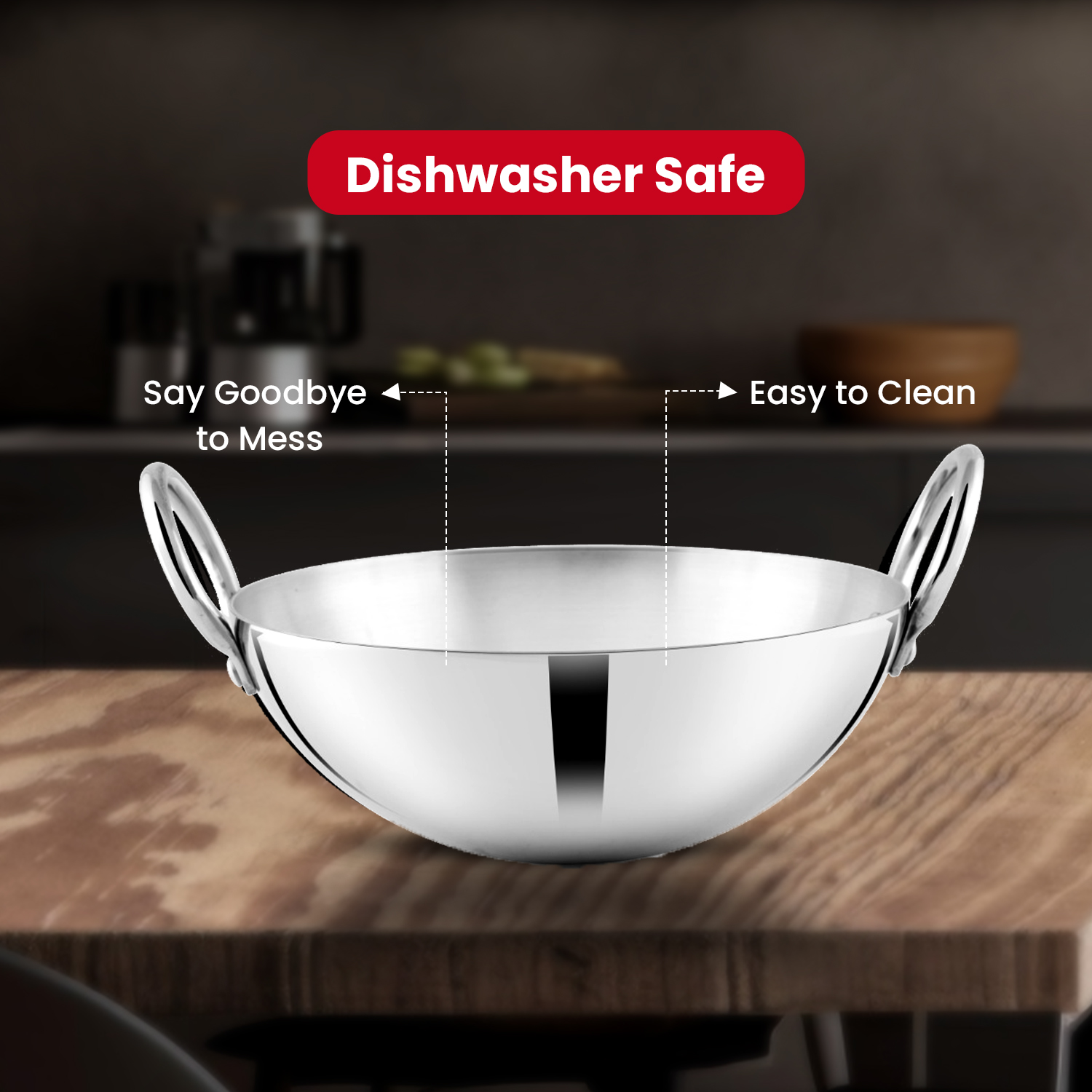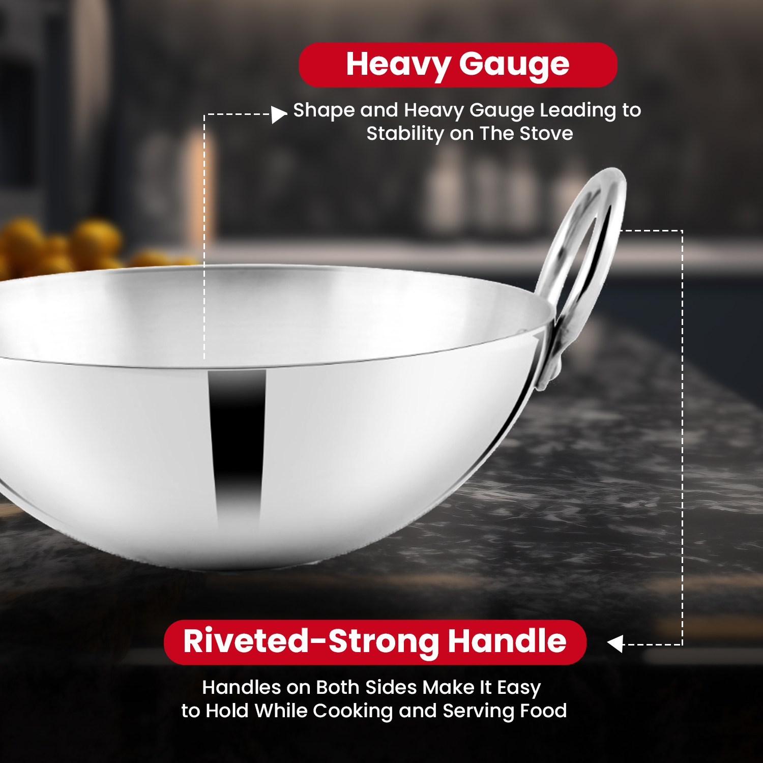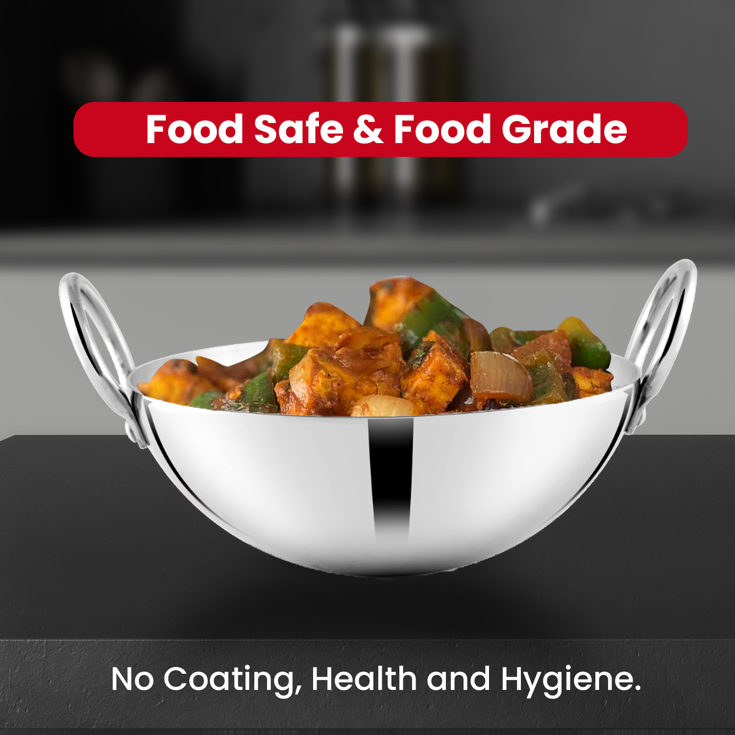 - Crafted from premium 430 grade stainless steel, our kadhai is built to last and resist staining and corrosion.